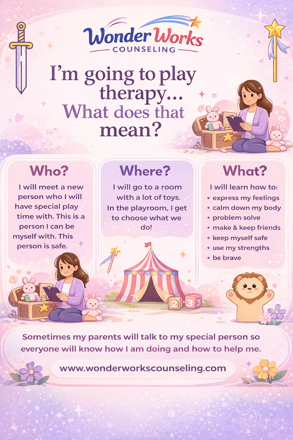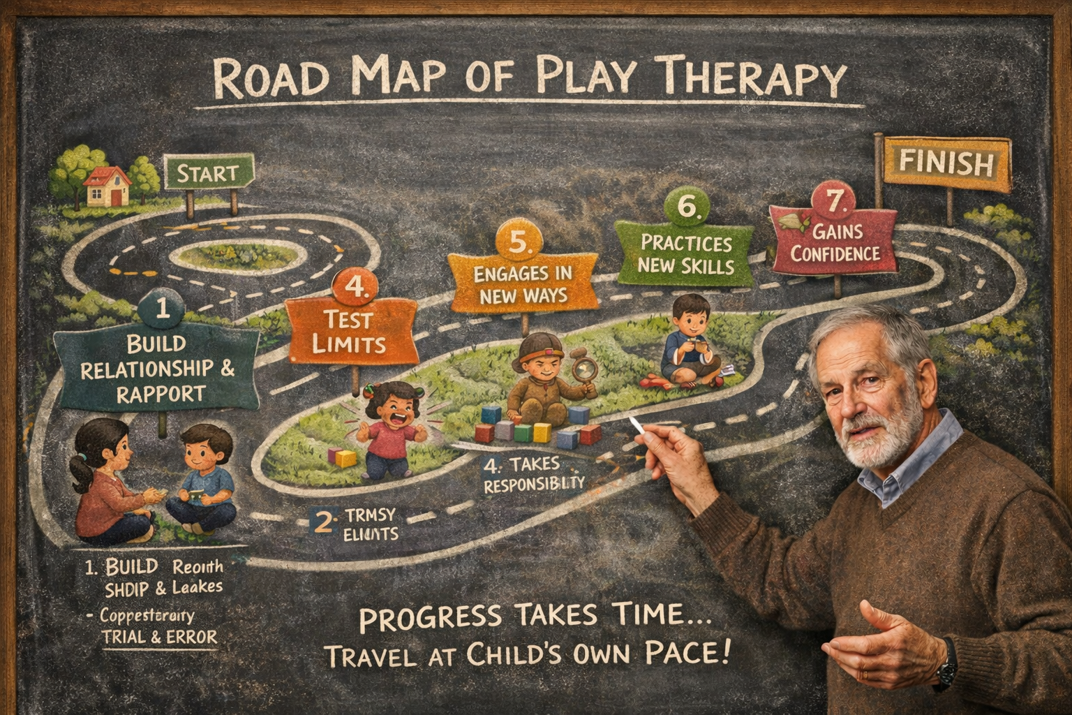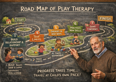 Progress in play therapy moves through seven stages. For more on what to expect at appointments, what progress looks like, how parents and caregivers support change, and more, CLICK HERE.